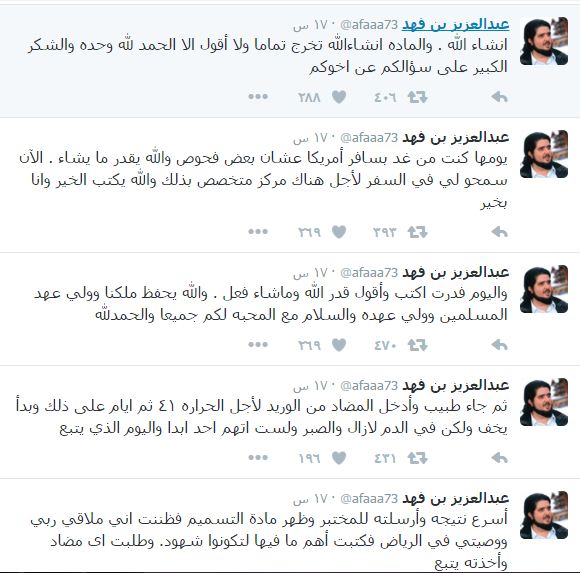 واختتم تغريداته: “واليوم قدرت اكتب وأقول قدر الله وما شاء فعل، والله يحفظ ملكنا وولي عهد المسلمين وولي عهده، يومها كنت من غد بسافر أميركا عشان بعض فحوص، والله يقدر ما يشاء، الآن سمحوا لي في السفر لأجل هناك مركز متخصص بذلك والله يكتب الخير وأنا بخير، والمادة إن شاء الله تخرج تمامًا ولا أقول إلا الحمد لله وحده والشكر الكبير على سؤالكم عن أخوكم”.