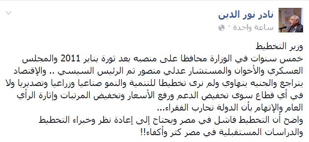 وأضاف “نورالدين”: “واضح أن التخطيط فاشل في مصر ويحتاج إلى إعادة نظر، وخبراء التخطيط والدراسات المستقبلية في مصر كثر وأكفاء!!“.