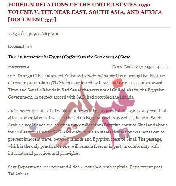 نسخة رسمية من برقية السفير الأمريكي في القاهرة إلى واشنطن يوم 30 يناير 1950 ويقول فيها إن مصر سيطرت على الجزيرتين باتفاق تام مع السعودية وإن ذلك يستند إلى حقوق البلدين حيث إن الجزيرتين أقرب إلى مصر.