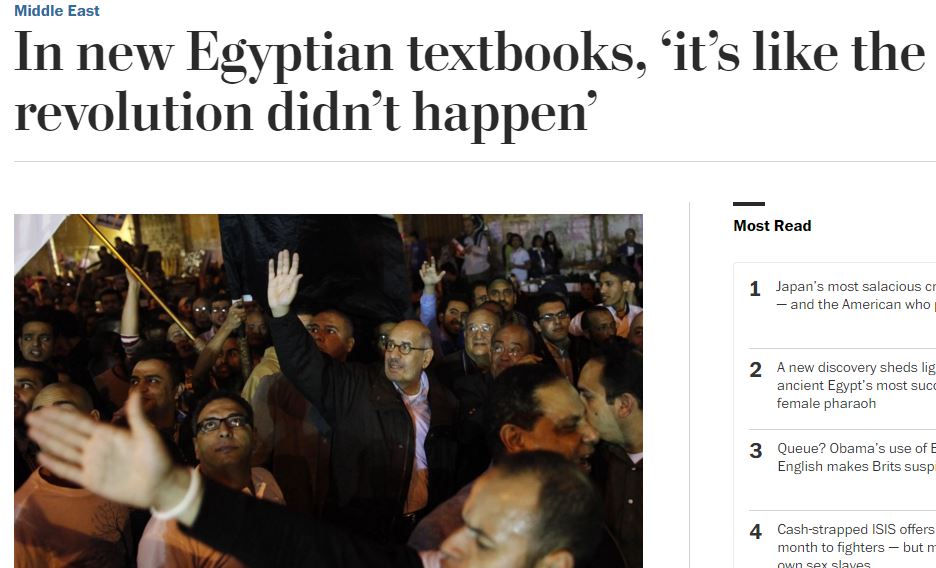 سلطت صحيفة “واشنطن بوست” الأميركية، الضوء على تبني وزارة التربية والتعليم للرواية التاريخية المتوافقة مع نظام السيسي عند وضعها للمناهج الدراسة؛ حيث تم تزوير أحداث ودوافع ثورة الخامس والعشرين من يناير، ومحو أي حديث عن الثورة في المناهج الدراسية.