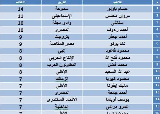 يتصدر حسام باولو، لاعب الفريق الأول لكرة القدم بنادي سموحة، جدول ترتيب الدوري المصري حتى الأسبوع الـ25 من منافسات البطولة، برصيد وصل إلى 14 هدفًا.