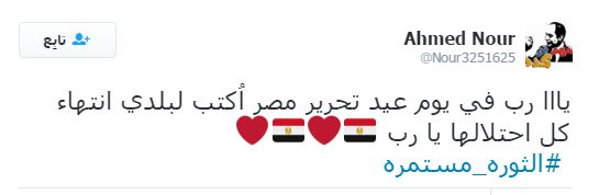 Ahmed Nour: “يااا رب في يوم عيد تحرير مصر اكتب لبلدي انتهاء كل احتلالها يا رب”.