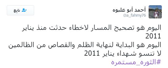 أحمد أبو عليوه: “اليوم هو تصحيح المسار لأخطاء حدثت منذ يناير 2011 اليوم هو البداية لنهاية الظلم والقصاص من الظالمين، لا تنسوا شهداء يناير 2011”.
