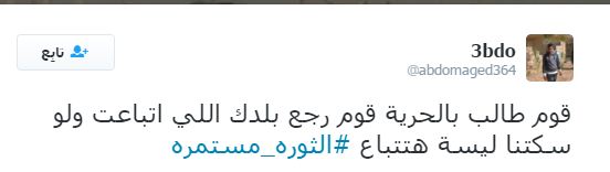 abdomaged: “قوم طالب بالحرية قوم رجع بلدك اللي اتباعت ولو سكتنا ليسة هتتباع”.