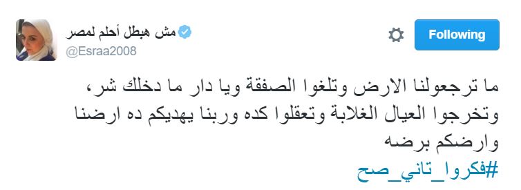 طالبت الناشطة السياسية إسراء عبدالفتاح، السلطة بإلغاء قرار التنازل عن تيران وصنافير للسعودية، والإفراج عن المعتقلين؛ حيث قالت -عبر تغريدة لها على “تويتر”-: “ما ترجعولنا الأرض وتلغوا الصفقة ويا دار ما دخلك شر، وتخرجوا العيال الغلابة وتعقلوا كده وربنا يهديكم دي أرضنا وأرضكم برضه”.