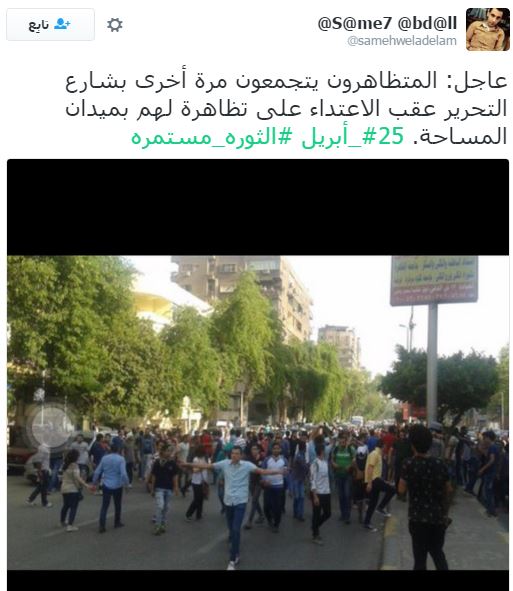 وشهدت معظم المحافظات اليوم تظاهرات لحركات شبابية وثورية؛ احتجاجا على تنازل عبدالفتاح السيسي عن جزيرتي تيران وصنافير للمملكة العربية السعودية، وواجهت قوات الأمن المتظاهرين باستخدام قنابل الغاز والخرطوش لتفريق التجمعات بالقاهرة وعدد من المحافظات.