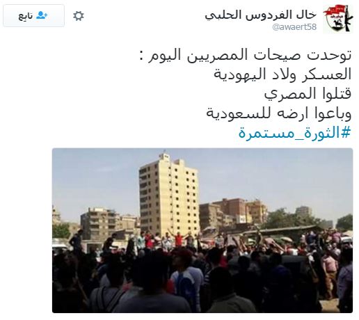 دشن رواد مواقع التواصل الاجتماعي هاشتاجا تحت اسم “#الثورة_مستمرة”، تزامنًا مع انطلاق مظاهرات معارضة لقرار عبدالفتاح السيسي، بالتنازل عن جزيرتي تيران وصنافير للمملكة العربية السعودية.