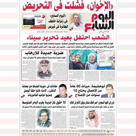 كما ابتعدت صحيفة “اليوم السابع” تماما عن ما جاء في اليوم من مظاهرات ومسيرات مناهضة للتنازل عن الجزيرتين، حيث جاء المانشيت “الإخوان تفشل في الحشد”، و”الشعب احتفل بعيد تحرير سيناء”.