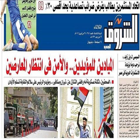 أما مانشيت صحيفة “الشروق” الرئيسي فأتى بعنوان “الميادين للمؤيدين.. والأمن في انتظار المعارضين”، وجاء العنوان الفرعي “الصحفيين ثكنة عسكرية أمام رافضي التنازل عن تيران وصنافير.. ومؤيدو الرئيس على سلالم النقابة”.