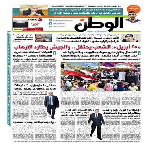 بينما تجاهلت صحيفة “الوطن”، مظاهرات اليوم وجاءت بمانشيت في الصفحة الأولى بعنوان “25 ابريل: الشعب يحتفل والجيش يطارد الإرهاب”، في حين جاء العنوان الفرعي “الاحتفال بذكرى تحرير سيناء بالورود والشيكولاتة”.