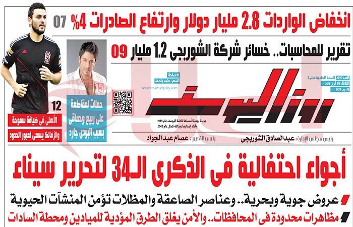 أما صحيفة “روزاليوسف” فمشت على نهج اليوم السابع ولم تتطرق إلى المظاهرات في العنوان الرئيسي الذي جاء بعنوان “أجواء احتفالية في الذكرى الـ34 لتحرير سيناء”.