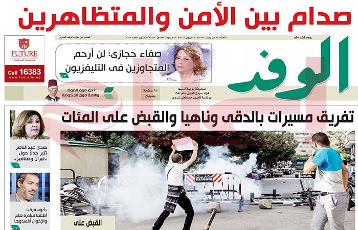 وبالنظر إلى صحيفة “الوفد” قالت في عنوانها الرئيسي “صدام بين الأمن والمتظاهرين”، والفرعي “تفريق مسيرات بالدقي وناهيا والقبض على المئات”.