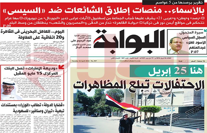 واكتفت صحيفة “البوابة” بقولها في العنوان الرئيسي “هنا 25 إبريل الاحتفالات تبلع المظاهرات”.