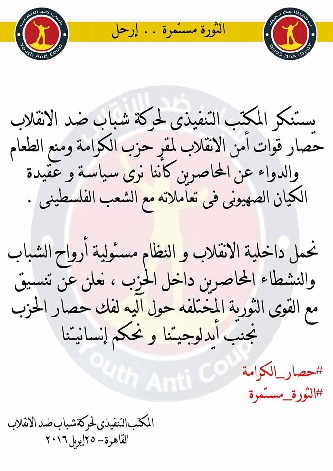 استنكر المكتب التنفيذي لحركة “شباب ضد الانقلاب” حصار قوات الأمن لمقر حزب الكرامة بالدقي ومنع الطعام والدواء عن المحاصرين.