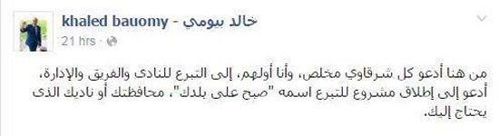 كتب “بيومي” -عبر صفحته الشخصية على موقع التواصل الاجتماعي “فيس بوك”-: “من هنا أدعو كل شرقاوي مخلص وأنا أولهم إلى التبرع للنادي والفريق والإدارة.. أدعو إلى إطلاق مشروع للتبرع اسمه “صبح على بلدك”، محافظتك أو ناديك الذي يحتاج إليك”.