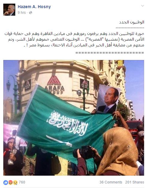 ونشر “حسني” صورة لبعض رافعي أعلام السعودية، وصور عبدالفتاح السيسي، وقال -في منشور على حسابه بموقع التواصل الاجتماعي “فيس بوك”-: “الوطنيون الجدد.. صورة للوطنيين الجدد وهم يرفعون رموزهم فى ميادين القاهرة وهم في حماية قوات الأمن المصرية نمشيها “المصرية”.. الوطنيون القدامى ضموهم لأهل الشر، وتم منعهم من مضايقة أهل الخير في الميادين أثناء الاحتفال بسقوط مصر”.