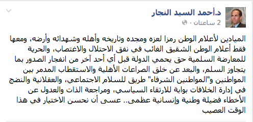 قال الدكتور أحمد السيد النجار، رئيس مجلس إدارة صحيفة الأهرام، تعليقًا على مظاهرات الدفاع عن الأرض: “الميادين لأعلام الوطن، رمزا لعزه ومجده وتاريخه، وأهله وشهدائه وأرضه، ومعها فقط أعلام الوطن الشقيق الغائب في نفق الاحتلال والاغتصاب”.
