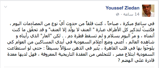 وتابع “زيدان”: “لكن العار الذي رأيناه وشاهده العالم، أعني وضع أعلام السعودية في أيدي المساكين من العوام كي يلوحّوا بها في قلب القاهرة، يُثير في الذهن سؤالًا بسيطًا: حتى لو استطاعت السعودية ابتلاع مصر، للتخلص من العقدة التاريخية المعروفة، فهل لديها معدة قادرة على الهضم”.
