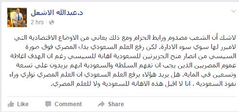 وقال “الأشعل”، في منشور له على صفحته بموقع التواصل الاجتماعي “فيس بوك”: “رغم أن الهدف إغاظة عموم المصريين الذين يجب أن تفهم السلطة والسعودية أنهم يزيدون على تسعة وتسعين في المائة، هل يريد هؤلاء برفع العلم السعودي أن العلم المصري توارى وراء نفوذ السعودية”.