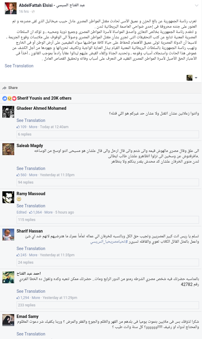 وأكد نشطاء أن الموقف المصري وبيان الرئاسة ليس لهما علاقة بمقتل المواطن المصري بقدر ما هما رد على الموقف الأوروبي من قتل الطالب الإيطالي، فإن هناك حالات اعتداء وإهانات متعددة يتعرض لها المصريون في الخارج، خلال الفترة الأخيرة، دون موقف حاسم من الدولة؛ حيث أصبح المصريون عرضة في كل مكان للاعتداءين البدني واللفظي، في ظل تخاذل الحكومة والاكتفاء بمجرد إصدار بيانات أو مطالبات بتحقيق دون اتخاذ إجراءات حقيقية على أرض الواقع.