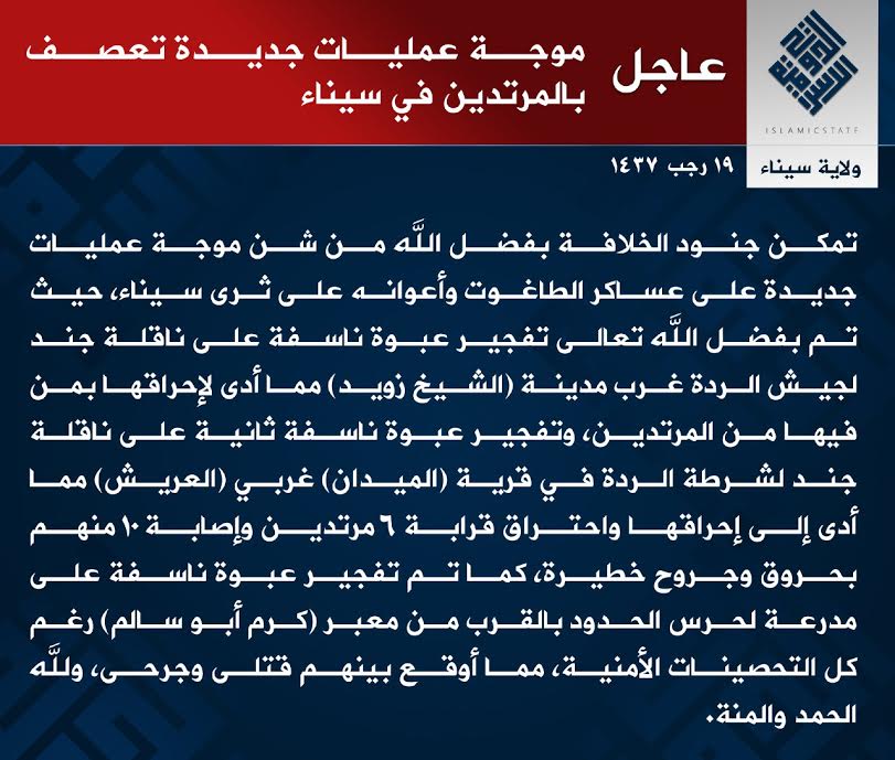تبني تنظيم الدولة عمليات تفجير صباح اليوم الأربعاء فى سيناء، كما أعلن عن عملية تفجير نوعية بمدرعة لحرس الحدود قرب معبر كرم أبو سالم من ناحية جنوب رفح
