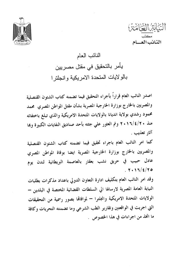 وكشف بيان صادر عن مكتب النائب العام عن إجراء التحقيق فيما تضمنه كتاب الشؤون القنصلية والمصريين بالخارج بوزارة الخارجية المصرية بشأن مقتل المواطن المصري محمد محمود رشدي بولاية إنديانا بالولايات المتحدة الأميركية والذي تبلغ باختفائه منذ 20 إبريل 2016، وتم العثور على جثته بأحد صناديق النقابات الكبيرة وبها آثار تعذيب.