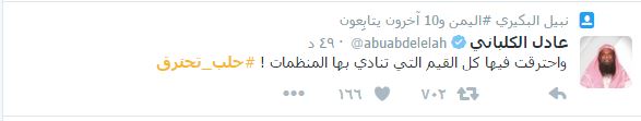 – الشيخ عادل الكلباني: “واحترقت فيها كل القيم التي تنادي بها المنظمات ! #حلب_تحترق”.