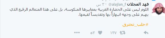 – أستاذ الثقافة الإسلامية بجامعة الملك سعود بالرياض، فهد العجلان: “اللوم ليس على الحضارة الغربية بمعاييرها المنكوسة، بل على هذا المتعالم الرقيع الذي يهيم على وجهه انبهارًا بها وتقديسًا لقيمها”.