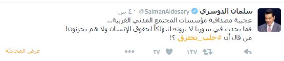 -رئيس تحرير صحيفة الشرق الأوسط اللندنية، سليمان الدوسري: “عجيبة مصداقية مؤسسات المجتمع المدني الغربية… فما يحدث في سوريا لا يرونه انتهاكاً لحقوق الإنسان ولا هم يحزنون! من قال أن #حلب_تحترق ؟!”.