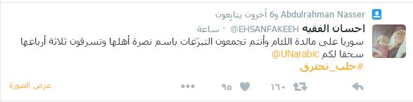 – إحسان الفقيه: “سوريا على مائدة اللئام وأنتم تجمعون التبرّعات باسم نصرة أهلها وتسرقون ثلاثة أرباعها، سحقا لكم @UNarabic”.