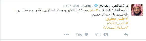 – الشيخ عائض القرني: ” اللهم أنقذ عبادك في حلب من غدر الغادرين، ومكر الماكرين، وأخرجهم سالمين، وارحمهم يا أرحم الراحمين”.