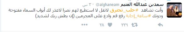 – المحامي السعودي، وعضو مجلس إدارة الهيئة الإسلامية العالمية للمحامين، سعد بن عبدالله الغنيم: “وأنت تشاهد حلب تحترق، لاتقل لا أستطيع لهم نصرًا، لاعذر لك أبواب السماء مفتوحة ودونك ساعة إجابة ارفع، قم، وادع على المجرمين “إن بطش ربك لشديد”.