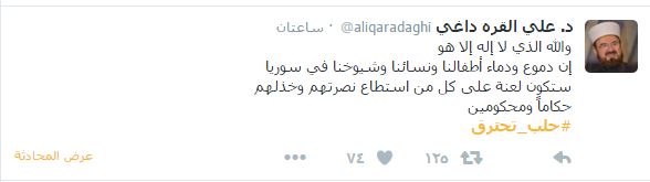 – د. علي القره داغي: “والله الذي لا إله إلا هو، إن دموع ودماء أطفالنا ونسائنا وشيوخنا في سوريا، ستكون لعنة على كل من استطاع نصرتهم وخذلهم، حكامًا ومحكومين”.