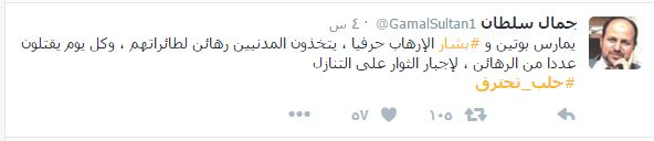 – رئيس تحرير صحيفة المصريون جمال سلطان: “يمارس بوتين و #بشار الإرهاب حرفيا ، يتخذون المدنيين رهائن لطائراتهم ، وكل يوم يقتلون عددا من الرهائن ، لإجبار الثوار على التنازل”.