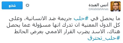 وقال العبدة -في تغريدة له عبر حسابه الرسمي على موقع “تويتر”-: “يحصل في حلب جريمة ضد الإنسانية، وعلى كل الدول المعنية أن تدرك أنها مسؤولة عما يحصل هناك، الأسد يضرب القرار الأممي بعرض الحائط حلب تحترق”.