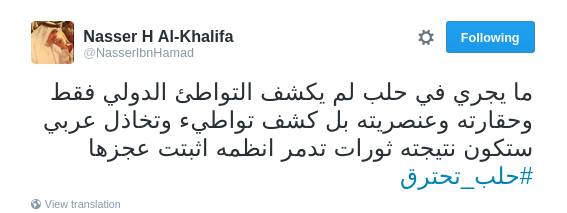 وقال -عبر تغريدة له على “تويتر”-: “ما يجري في حلب لم يكشف التواطؤ الدولي فقط وحقارته وعنصريته، بل كشف تواطؤًا وتخاذلًا عربيًا ستكون نتيجته ثورات تدمر أنظمة أثبتت عجزها”.