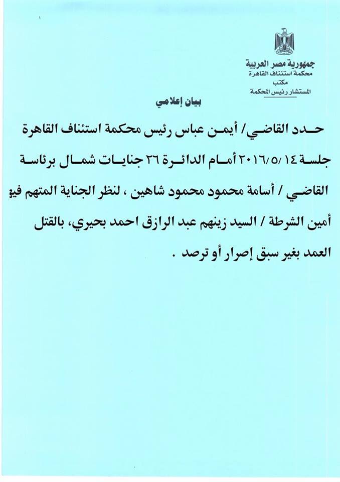 حددت محكمة استئناف القاهرة، برئاسة المستشار أيمن عباس، جلسة 14 مايو المقبل، لنظر أولى جلسات محاكمة أمين الشرطة السيد زينهم عبدالرازق أحمد بحيري، المتهم بقتل بائع منطقة الرحاب.