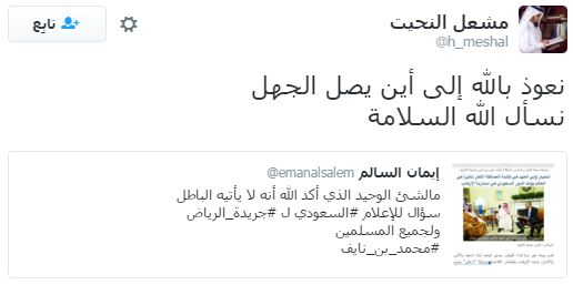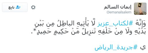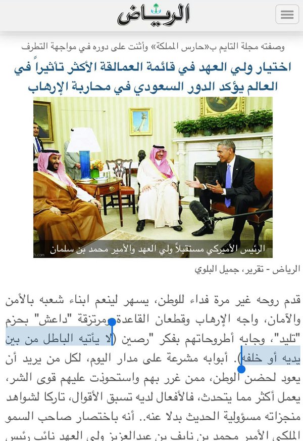 وصفت جريدة “الرياض” السعودية، ولي العهد السعودي الأمير محمد بن نايف، بأنه “لا يأتيه الباطل من بين يديه ولا من خلفه”، تشبيهًا بالقرآن الكريم.