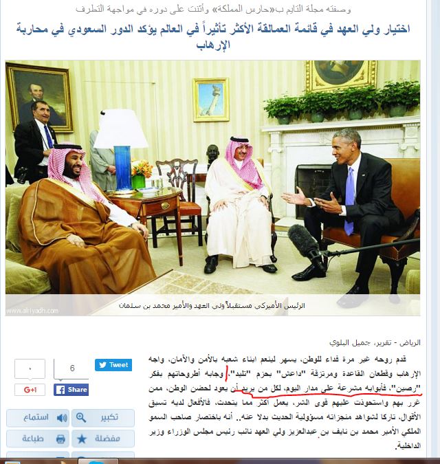 هذا الوصف جاء في التقرير الذي كتبه الصحفي السعودي، جميل البلوي، تحت عنوان “وصفته مجلة التايم بـ(حارس المملكة) وأثنت على دوره في مواجهة التطرف.. اختيار ولي العهد في قائمة العمالقة الأكثر تأثيراً في العالم يؤكد الدور السعودي في محاربة الإرهاب”.