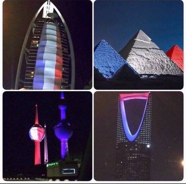 التضامن العربي والعالمي لم يكتف، بالمسيرات فقط، فقد أضاءت العديد من دول العالم علم فرنسا على أهم رموزها، أبزهم برج دبي في الإمارات، وهرم خوفو في القاهرة، كما أنيرت بعض المعالم في السعودية والكويت وغيرها من دول العالم.