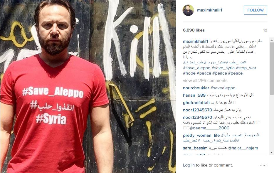أعلن الممثل السوري مكسيم خليل تضامنه مع ضحايا حلب، من خلال نشر صورته على موقع التواصل الاجتماعي “إنستجرام”، مرتديا قميص أحمر اللون طبع عليه هاشتاج “أنقذوا حلب”، ضمن حملة دولية تحمل نفس الاسم للفت أنظار العالم لما يحدث في سوريا.