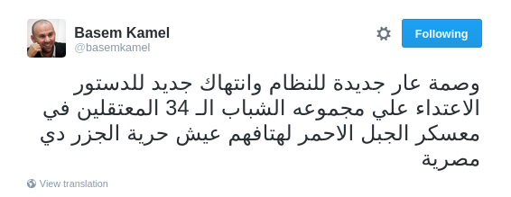 وقال -عبر تغريدة له على “تويتر”-: “وصمة عار جديدة للنظام وانتهاك جديد للدستور، الاعتداء على مجموعة الشباب الـ34 المعتقلين في معسكر الجبل الأحمر لهتافهم عيش حرية الجزر دي مصرية”.