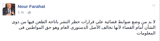 طالب الدكتور محمد نور فرحات، الفقيه الدستوري، بضرورة وضع ضوابط قضائية على قرارات حظر النشر؛ لأنها تخالف الأصل الدستوري.
