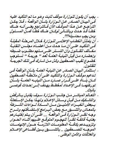 – التعامل المباشر من جانب الوزارة سوف يقابل بالرفض والتشكيك من قبل وسائل الإعلام ولهذا يمكن الاستعانة ببعض الخبراء الأمنيين من السادة لواءات الشرطة بالمعاش والتنسيق مع بعض البرامج لاستضافتهم وشرح وجه نظر الوزارة في الواقعة.. على أن يتم اختيارهم بعناية فائقة نظرًا للهجوم المتوقع عليهم أثناء الحوار وتزويدهم بكل المعلومات اللازمة حول الاتهامات الموجهة للصحفيين.. بالتنسيق بين قطاعي الإعلام والعلاقات والأمن الوطني.