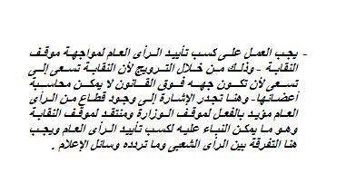 – يجب العمل على كسب تأييد الرأي العام لمواجهة موقف النقابة، وذلك من خلال الترويج لأن النقابة تسعى إلى أن تكون جهة فوق القانون لا يمكن محاسبة أعضائها، وهنا تجدر الإشارة إلى وجود قطاع من الرأي العام مؤيد بالفعل لموقف الوزارة ومنتقد لموقف النقابة وهو ما يمكن البناء عليه لكسب تأييد الرأي العام ويجب هنا التفرقة بين الرأي الشعبي وما تردده وسائل الإعلام.
