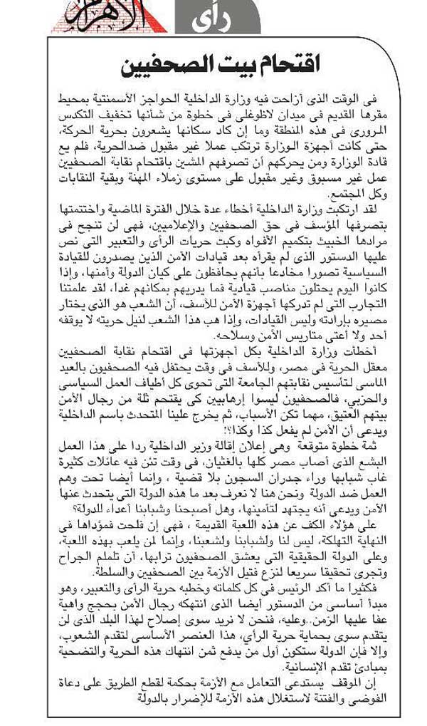 أخطأت وزارة الداخلية بكل أجهزتها في اقتحام نقابة الصحفيين معقل الحرية في مصر، وللأسف في وقت يحتفل فيه الصحفيون بالعيد الماسي لتأسيس نقابتهم الجامعة التي تحوي كل أطياف العمل السياسي والحزبي، فالصحفيون ليسوا إرهابيين كي يقتحم ثلة من رجال الأمن بيتهم العتيق، مهما تكن الأسباب، ثم يخرج علينا المتحدث باسم الداخلية ويدعي أن الأمن لم يفعل كذا وكذا؟!
