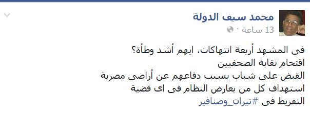 وقال -عبر منشور له على “فيس بوك”-: “في المشهد أربعة انتهاكات، أيهم أشد وطأة؟ اقتحام نقابة الصحفيين، القبض على شباب بسبب دفاعهم عن أراضٍ مصرية، استهداف كل من يعارض النظام في أي قضية، التفريط في تيران وصنافير”.