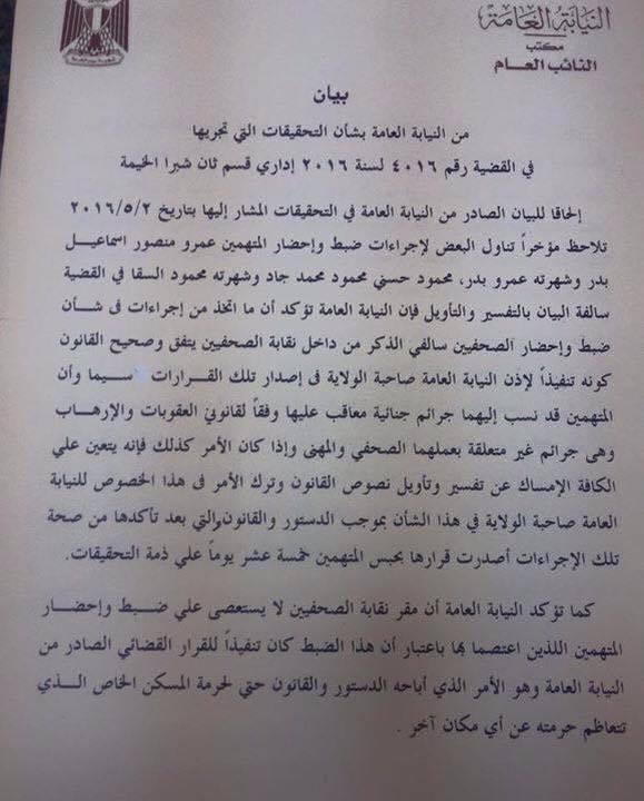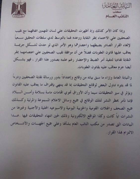 وأشار النائب العام في بيان أصدره منذ قليل إلى أن دخول الداخلية لمقر نقابة الصحفيين لتنفيذ أمر ضبط الزميلين عمرو بدر ومحمود السقا، يتفق مع القانون.