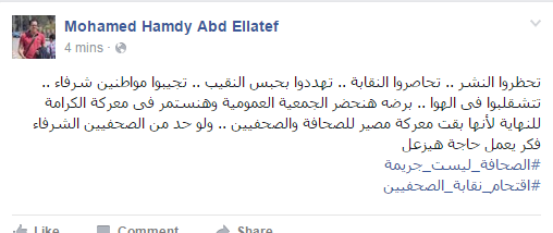 وقال الصحفي محمد حمدي: “تحظروا النشر.. تحاصروا النقابة.. برضه هنحضر الجمعية العمومية وهنستمر في معركة الكرامة”.