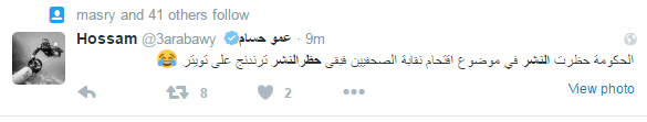 وسخر حسام قائلا: “الحكومة حظرت النشر في موضوع اقتحام نقابة الصحفيين فبقى حظر النشر ترندنج على “تويتر”.